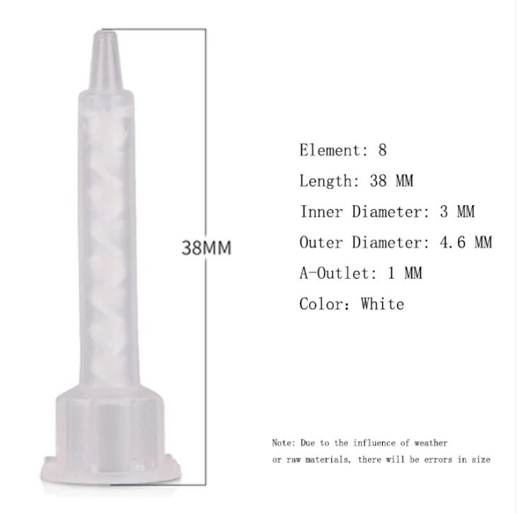 * Specification: Mixing Ratios: 1: 1, 2: 1 Material: Plastic Color: Transparent, White Overall Length: 103mm / 4.06-inch Bell Mouth Inner Dia.: 1.5mm / 0.06-inch Tube Diameter: 7.6mm / 0.3-inch Inner Diameter: 5.3mm / 0.21-inch Section Number: 17 Package Content: 20 x Mixing Nozzle.