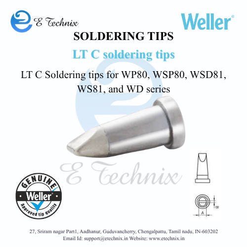 (Ex- GST) + Delivery ChargesThe Weller LT-C Soldering Tip is a 2.4 mm chisel-shaped tip from Weller’s LT series, engineered for excellent heat transfer, durability, and precision. Ideal for use with Weller’s WP80, WSP80, WSD81, WS81, and WD series soldering stations, it provides superior control and long service life — perfect for electronic assembly, repair, and rework applications.