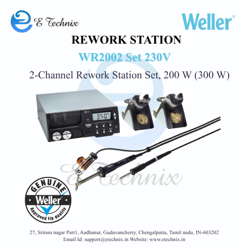 The Weller WR 2002 is a professional-grade 2-channel rework station designed for advanced soldering and desoldering tasks, featuring simultaneous tool operation, ESD safety, and automatic tool recognition.